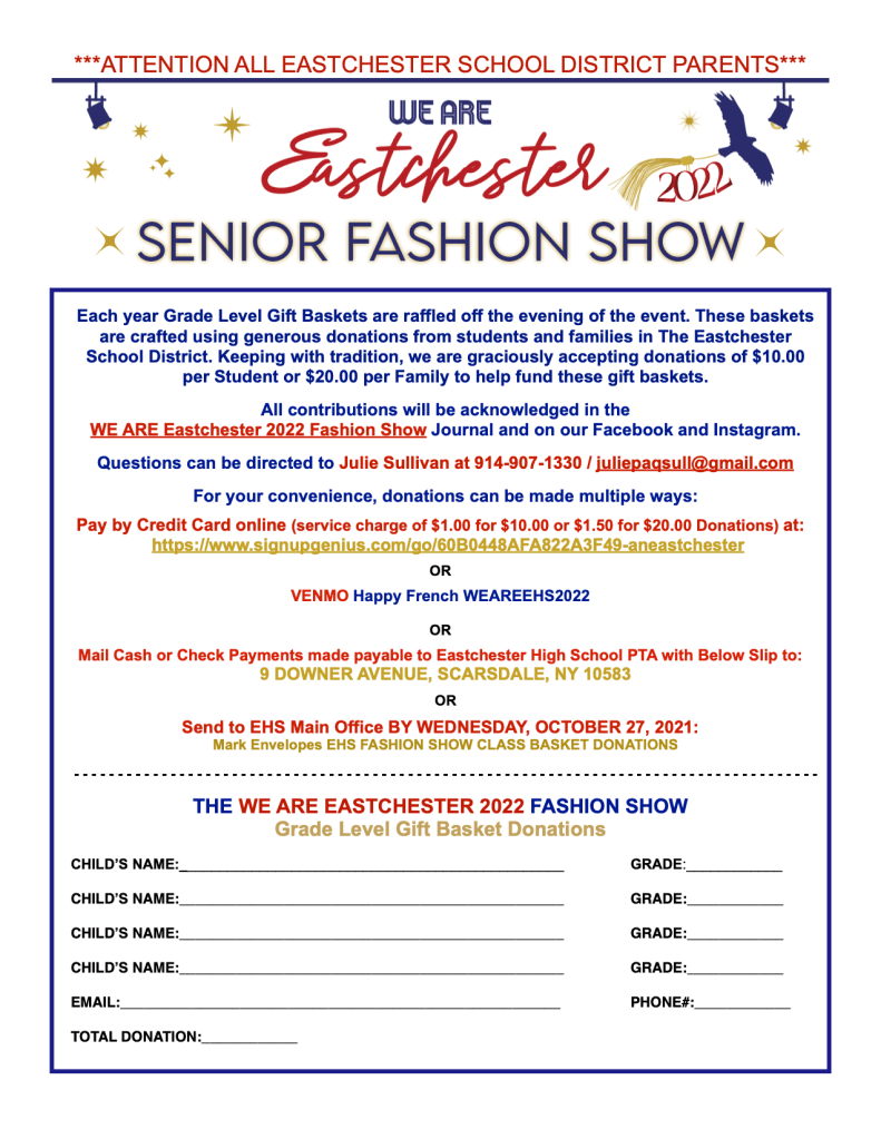 While the EHS Fashion Show is for the graduating seniors each year, it’s a community event. It’s the major fundraiser for all of the programs at EHS and requires lots of support from the K-12 Community. The funds from this one event cover a bulk of the expenses that EHS PTA incurs each year, so we can’t stress enough, that we need all hands on deck to make this night a success for ALL students and staff at EHS.