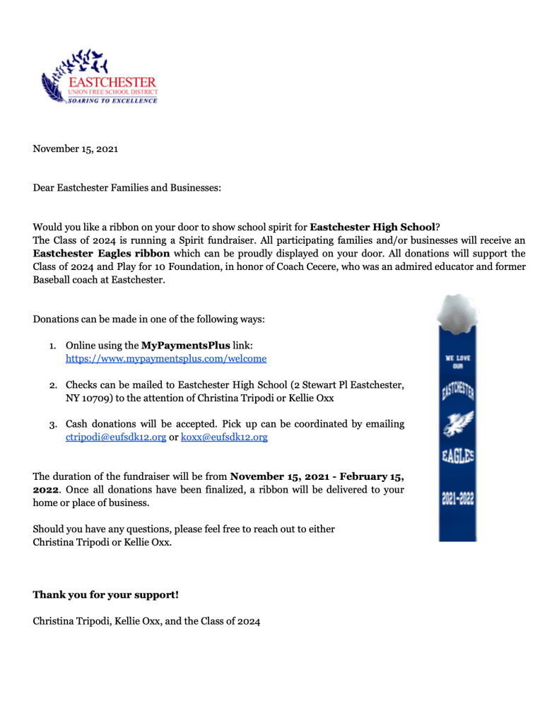 We Love Our Eastchester Eagles Ribbons https://www.mypaymentsplus.com/welcome For more info, email ctripodi@eufsdk12.org or koxx@eufsdk12.org Share this: Share on X (Opens in new window) X Share on Facebook (Opens in new window) Facebook Like Loading... Related