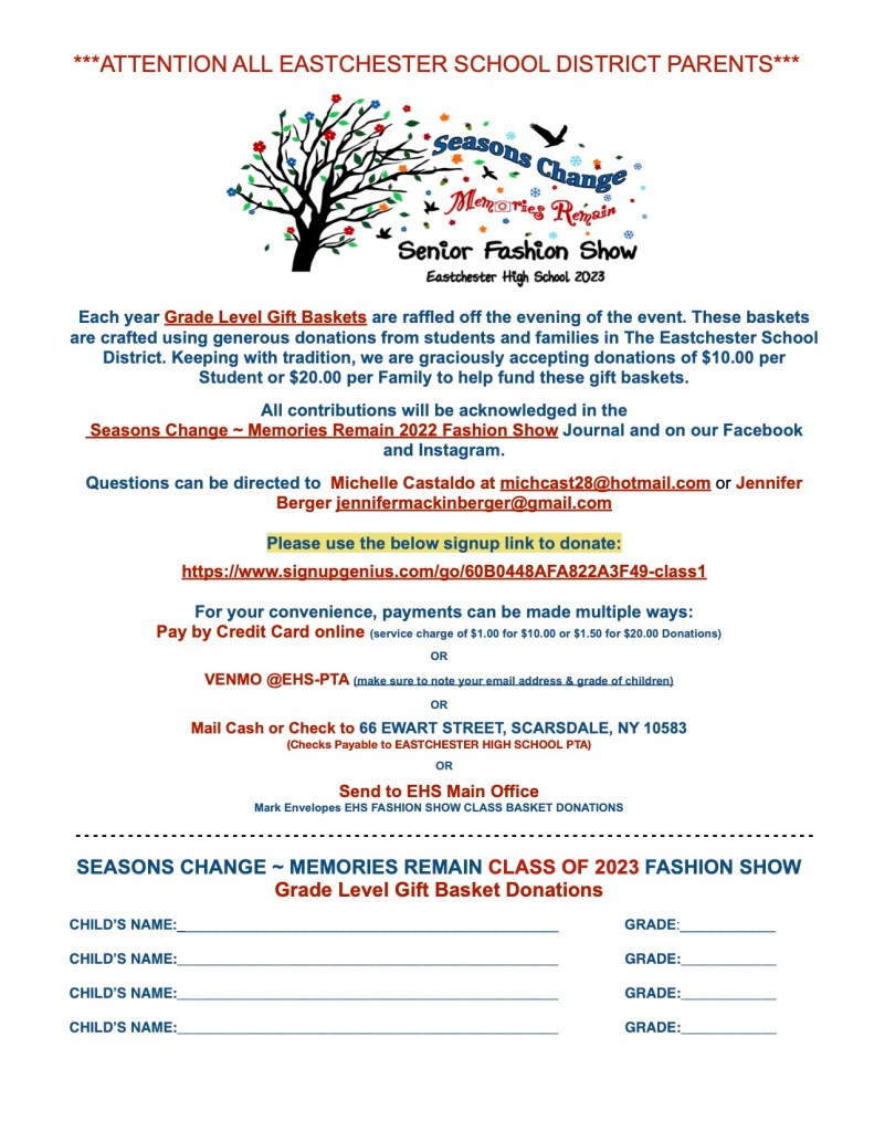 There are so many ways to contribute to your class basket. The simplest is by using the Venmo app to make a contribution electronically. Cash or check donations can be delivered to the EHS main office, PTA mailbox or sent to the address below. We thank you ALL for helping us make our ONE fundraiser of the school year a success!