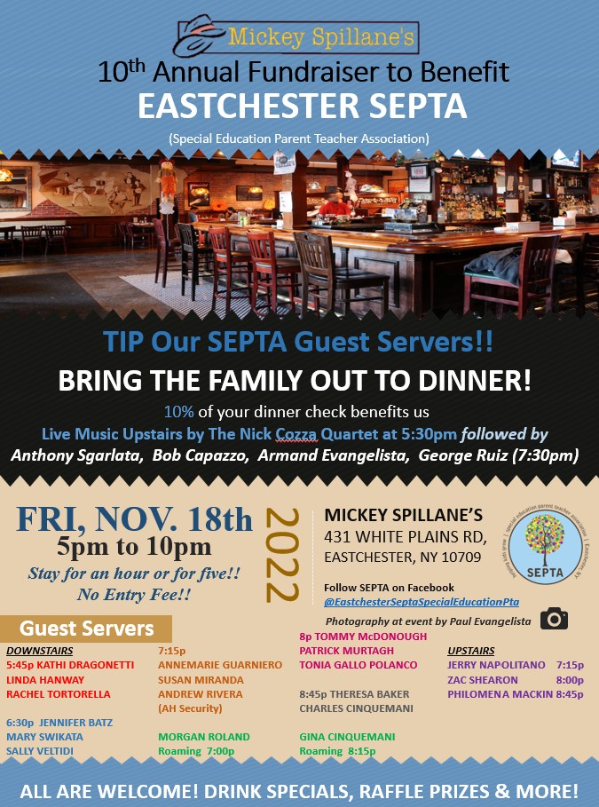 Friday 11/18: 10th Annual Fundraiser to Benefit Eastchester SEPTA To make a donation: https://eastchester-septa.square.site/product/general-donations-mickey-spillane-s-annual-fundraiser-for-septa/37?cs=true&cst=custom Share this: Share on X (Opens in new window) X Share on Facebook (Opens in new window) Facebook Like Loading... Related