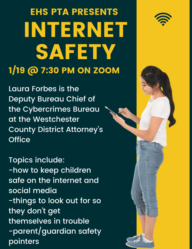 Our January 19th meeting will be held on Zoom. We have invited Laura Forbes from the Westchester County District Attorney’s Office to speak about Internet Safety and Cybercrimes. While we normally encourage students to participate in meetings, this presentation is geared toward parents.
