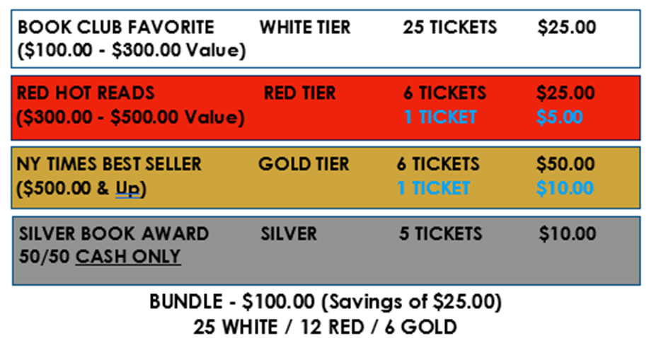 **For the first time ever, ONLY pre-purchased ticket bundles will be LABELED WITH YOUR NAME AND TABLE***